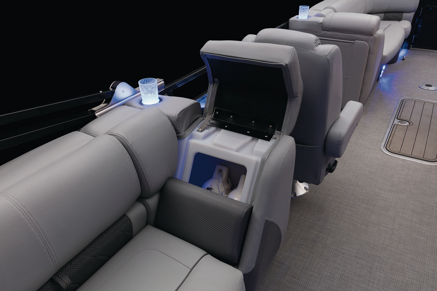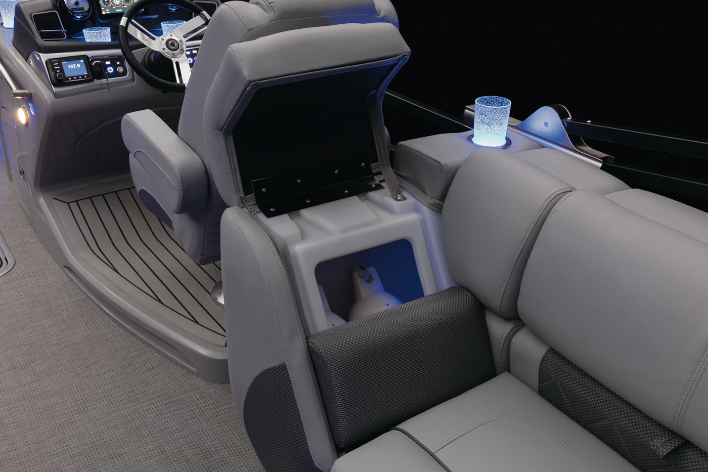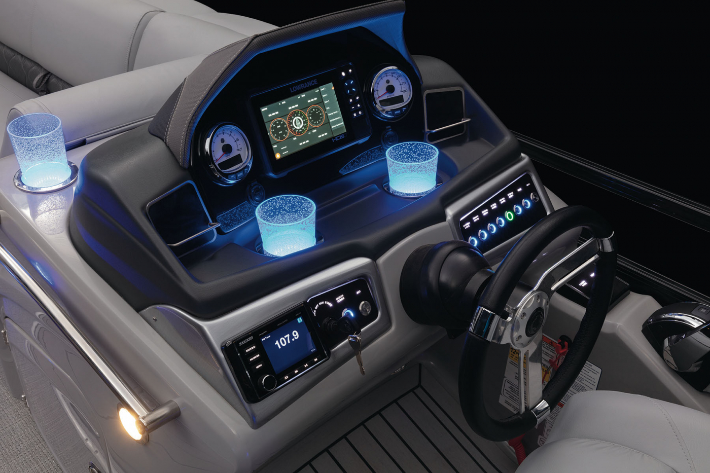 And for comfort and convenience, the standard features include four spacious lounges, each with STOW MORE™ storage system. It also includes fore and aft lighted table base locations, a new Medallion® Viper III multifunction capacitive touch digital dash with Wet Sounds® amp and speakers.