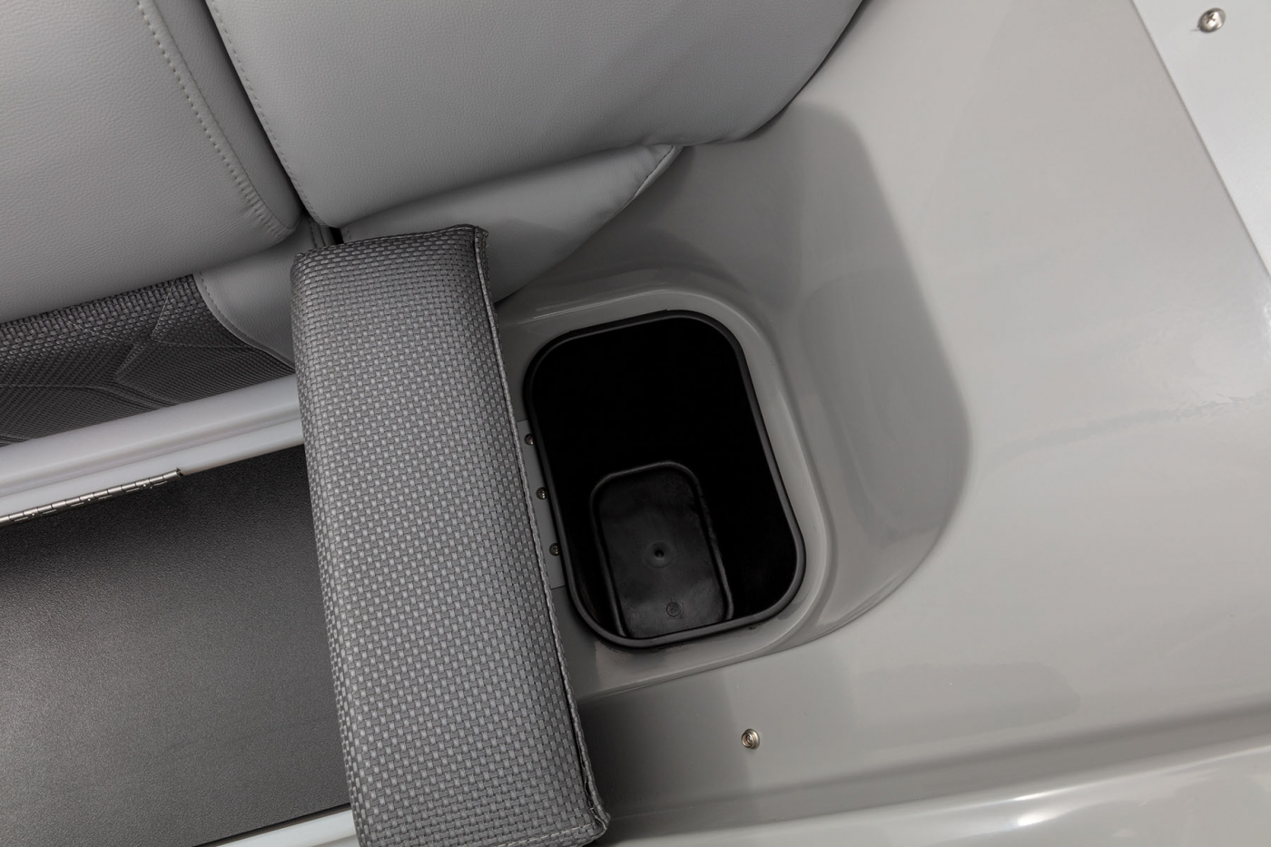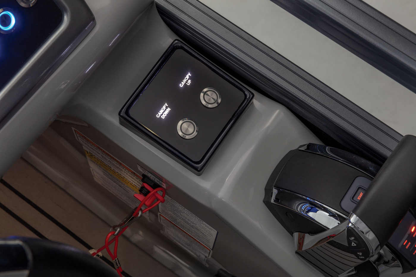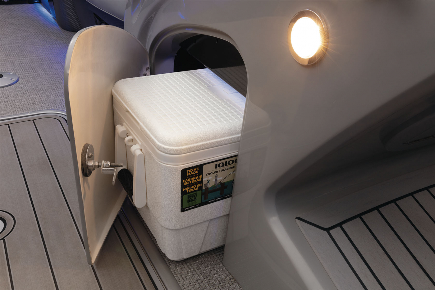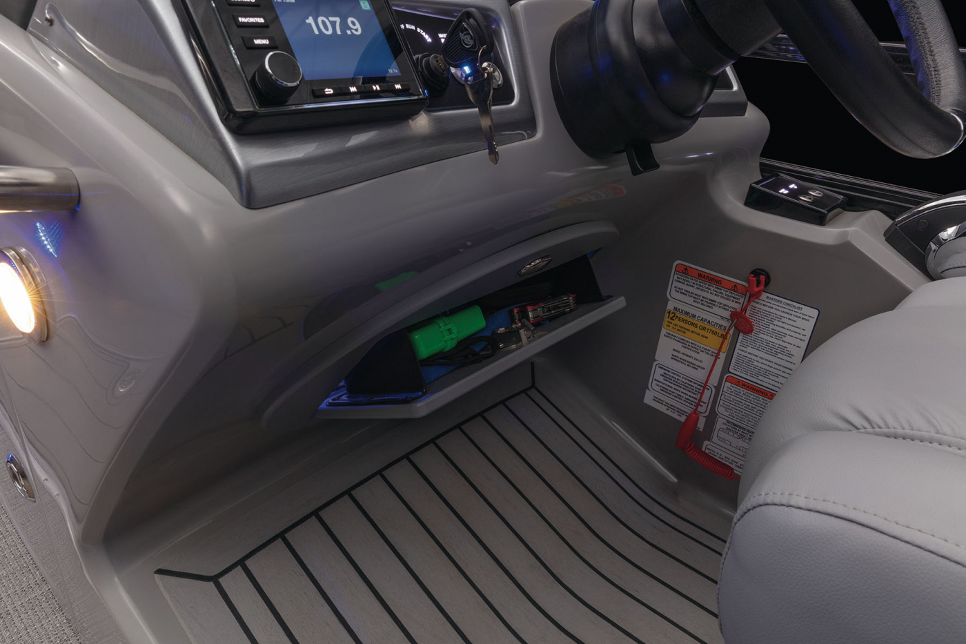 And for comfort and convenience, the standard features include four spacious lounges, each with STOW MORE™ storage system. It also includes fore and aft lighted table base locations, a new Medallion® Viper III multifunction capacitive touch digital dash with Wet Sounds® amp and speakers.