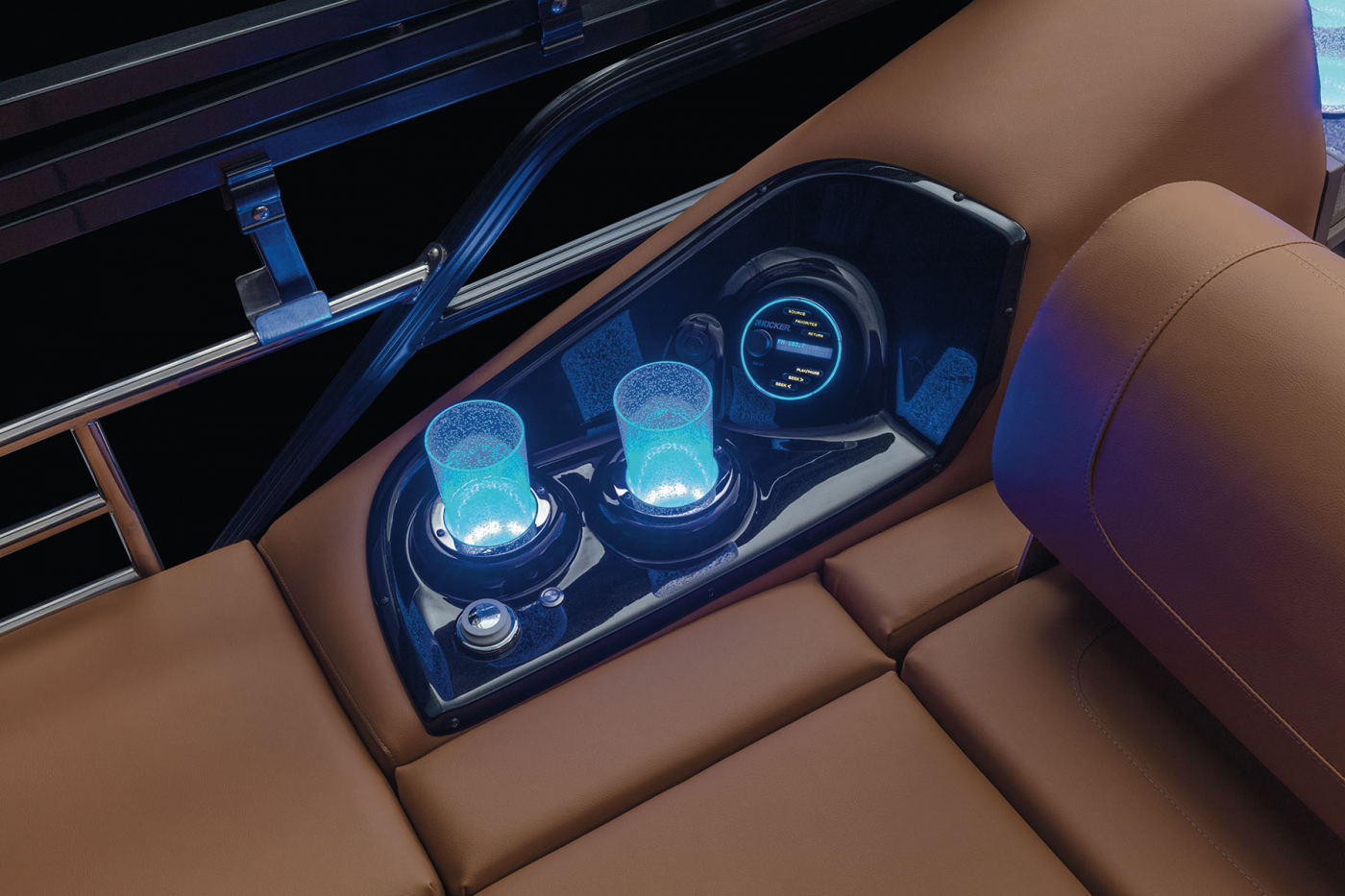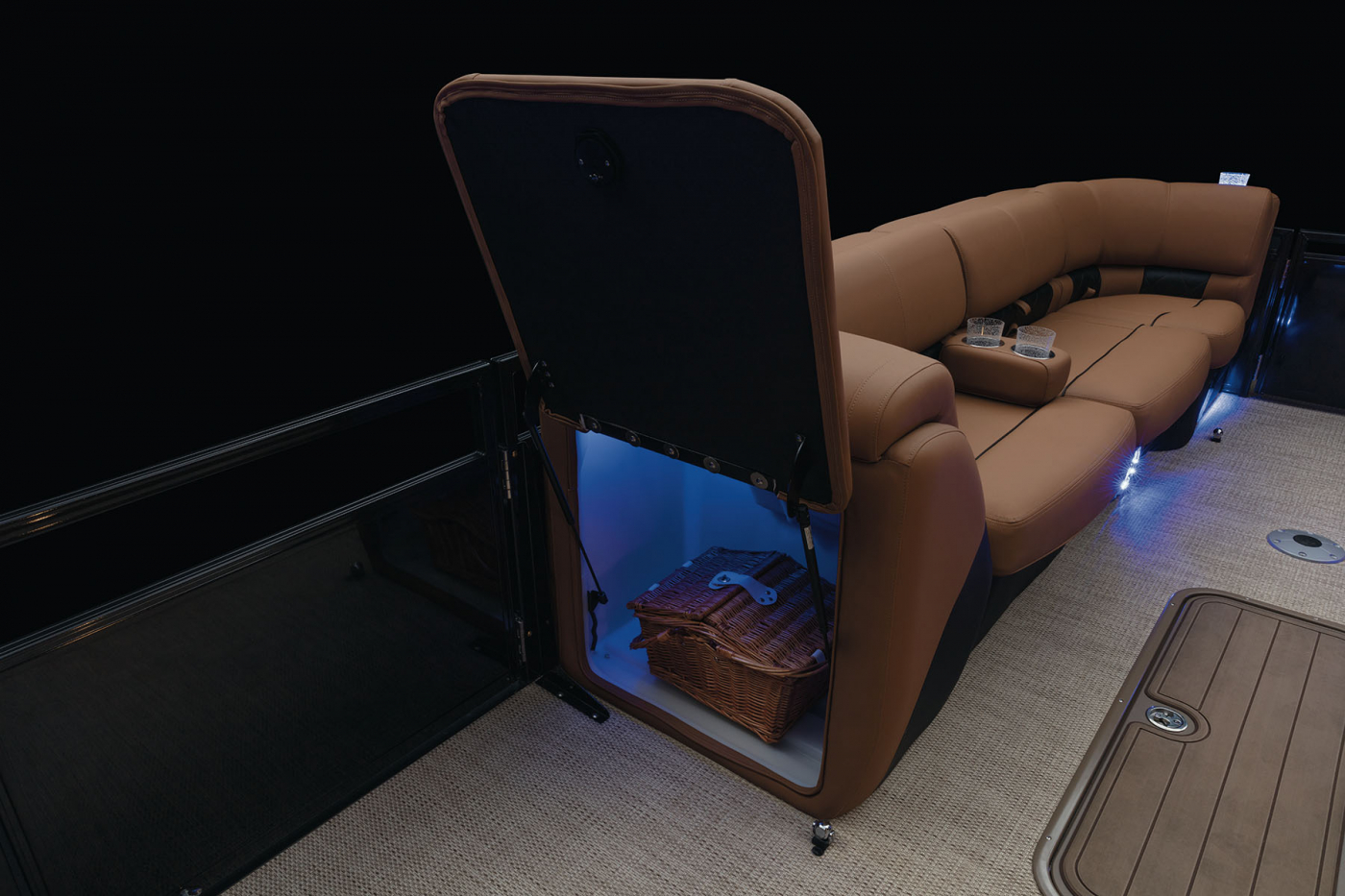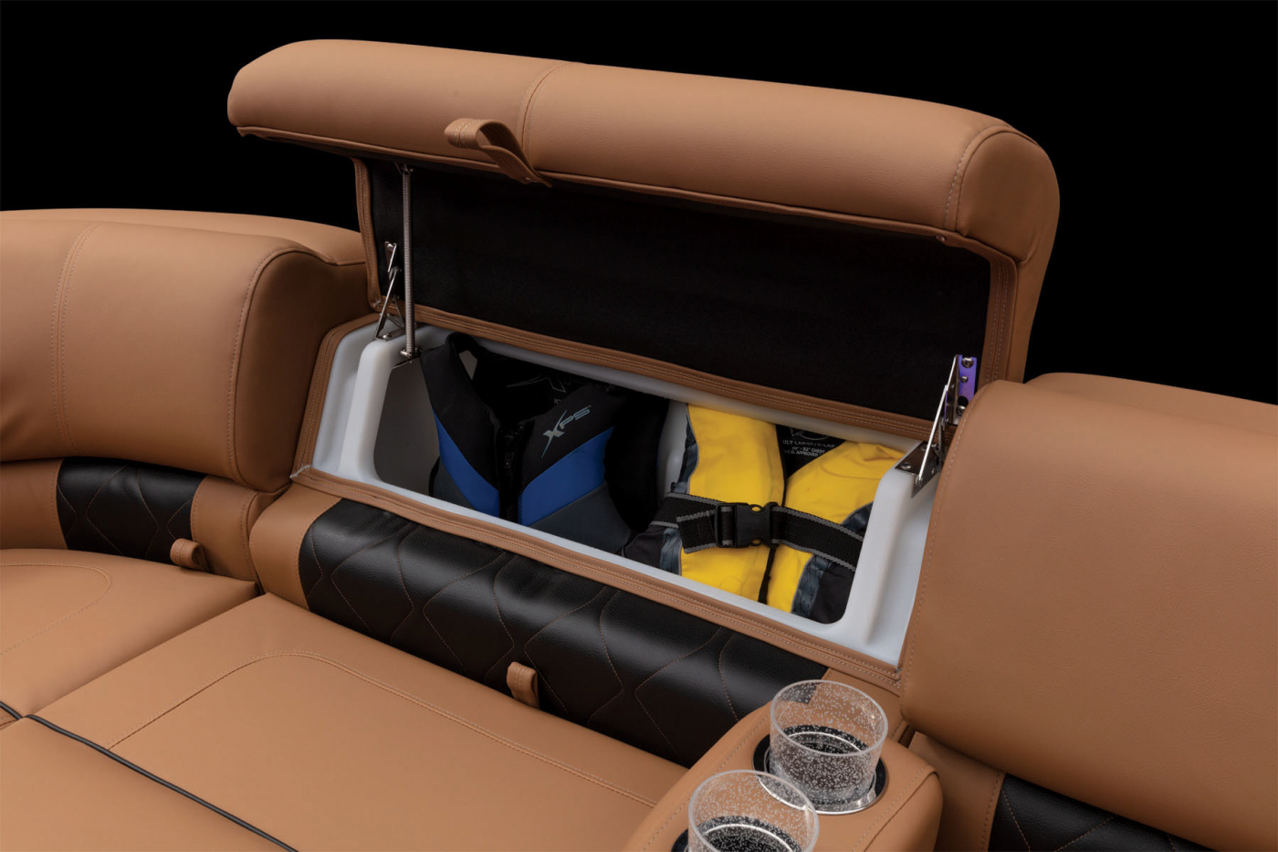 For those who enjoy the sport side of life, three 26” pontoon logs, complete with lifting strakes, a 350-horsepower rating, ski tow pylon and more provide exhilarating performance for watersports. The switchback lounge provides a comfortable sport to watch the action.
