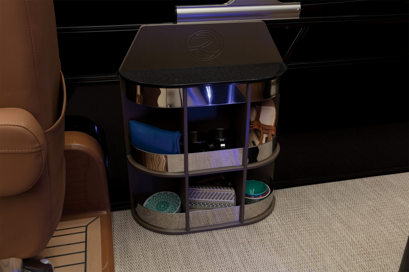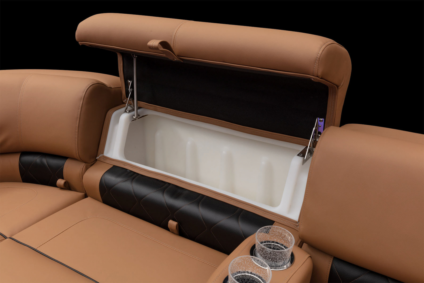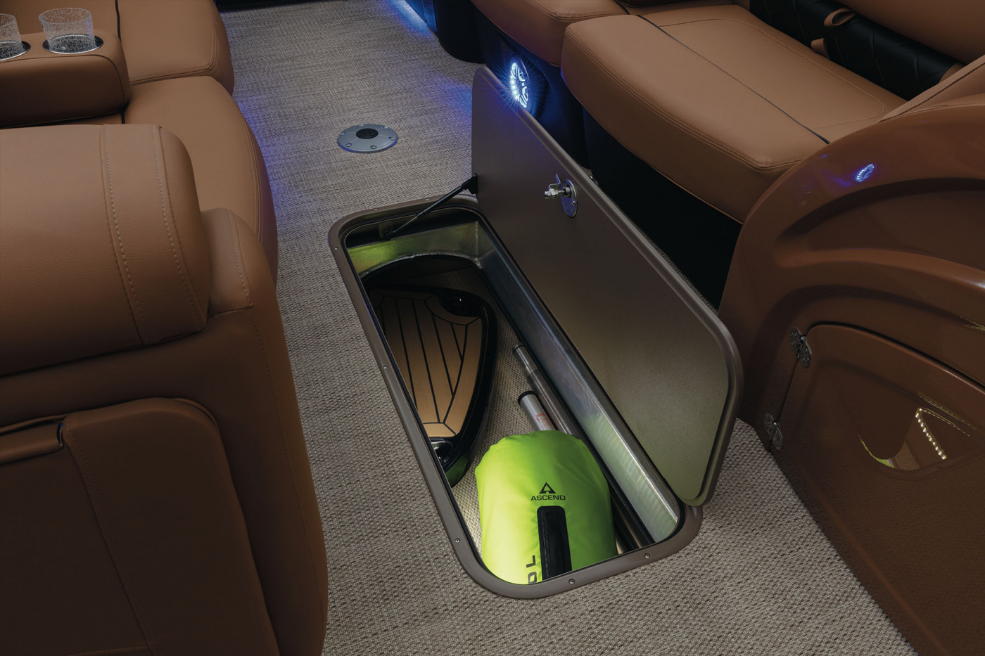 For those who enjoy the sport side of life, three 26” pontoon logs, complete with lifting strakes, a 350-horsepower rating, ski tow pylon and more provide exhilarating performance for watersports. The switchback lounge provides a comfortable sport to watch the action.